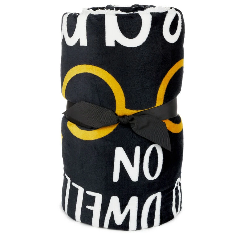 Warm yourself in this cozy reminder to live in the present. Our Harry Potter blanket is made from luxurious black jersey knit with Sherpa fleece backing. Featuring an iconic quote from Albus Dumbledore and embroidered details, this blanket will be your go-to for marathon movie watching and cool weather cuddling. Harry Potter fans will love to wrap themselves in memories—and make new ones—as they snuggle on the couch with loved ones wrapped in this soft throw.